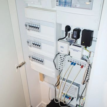 Sistem pendawaian utama bagi premis komersial atau industri, termasuk pemasangan panel agihan (DB), sistem lampu kecemasan, dan perlindungan kilat.
